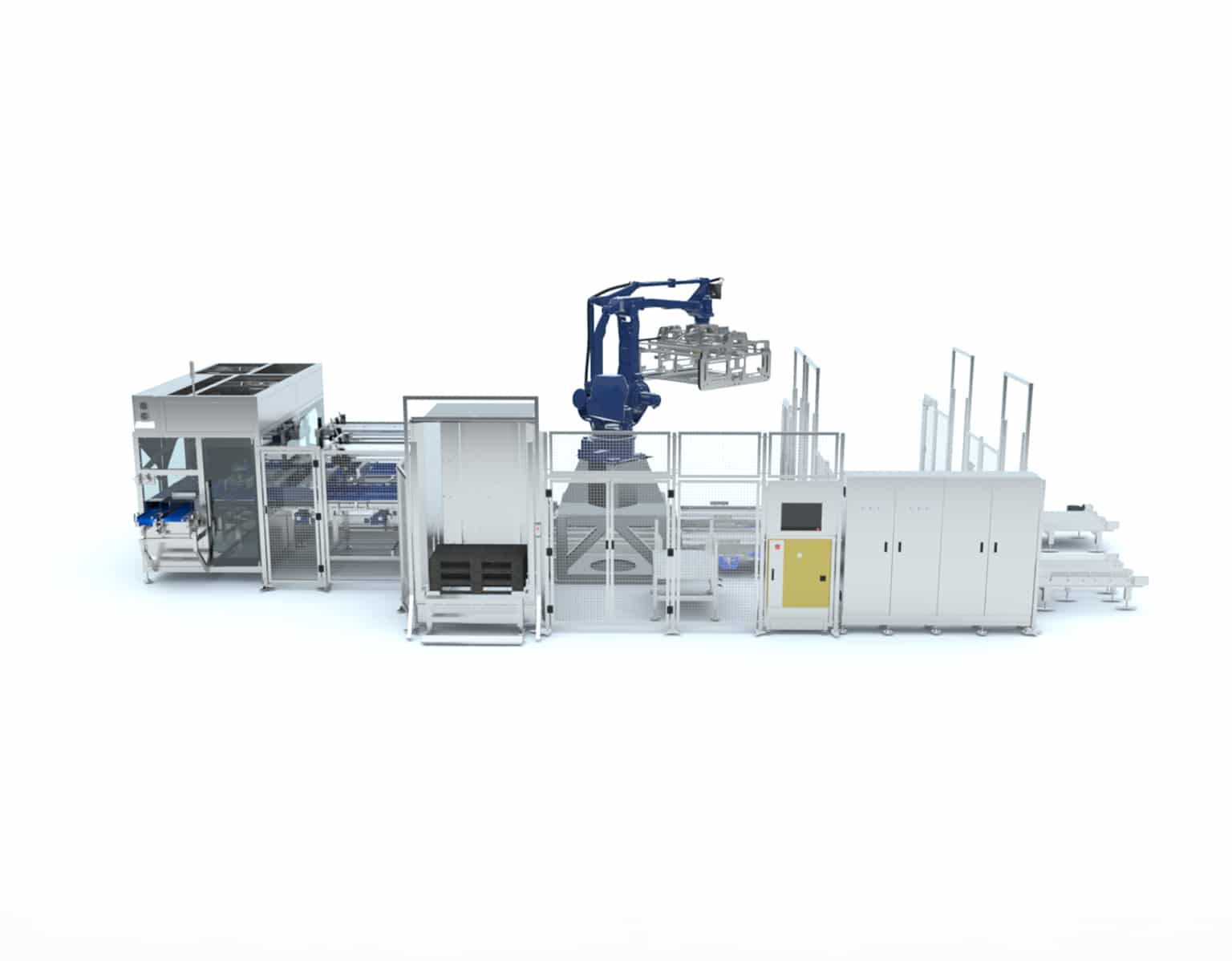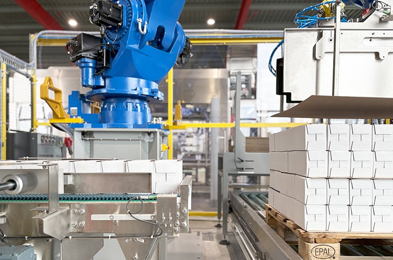 Au-delà de la simple mise sur palette, nos palettiseurs automatiques peuvent être complétés par de nombreuses fonctionnalités : gestion automatisée des intercalaires, entrée et sortie des palettes pleines et vides, stockeur de palettes vides, dépalettiseur, empileur de caisses en amont, portes à ouverture et fermeture automatiques. Ces options vous permettent alors de disposer d’un système entièrement automatisé, clé en main et sécurisé pour vos opérateurs.